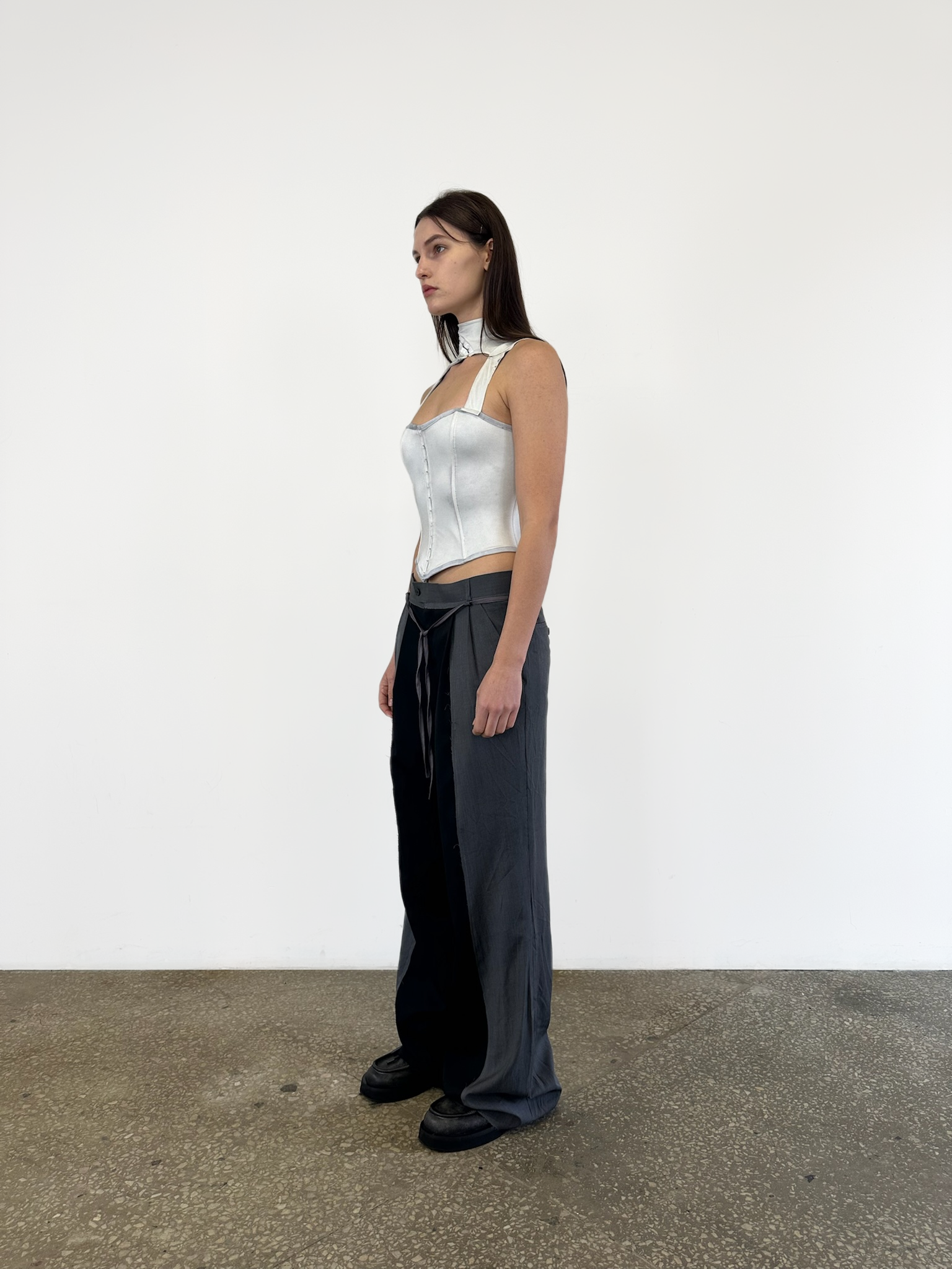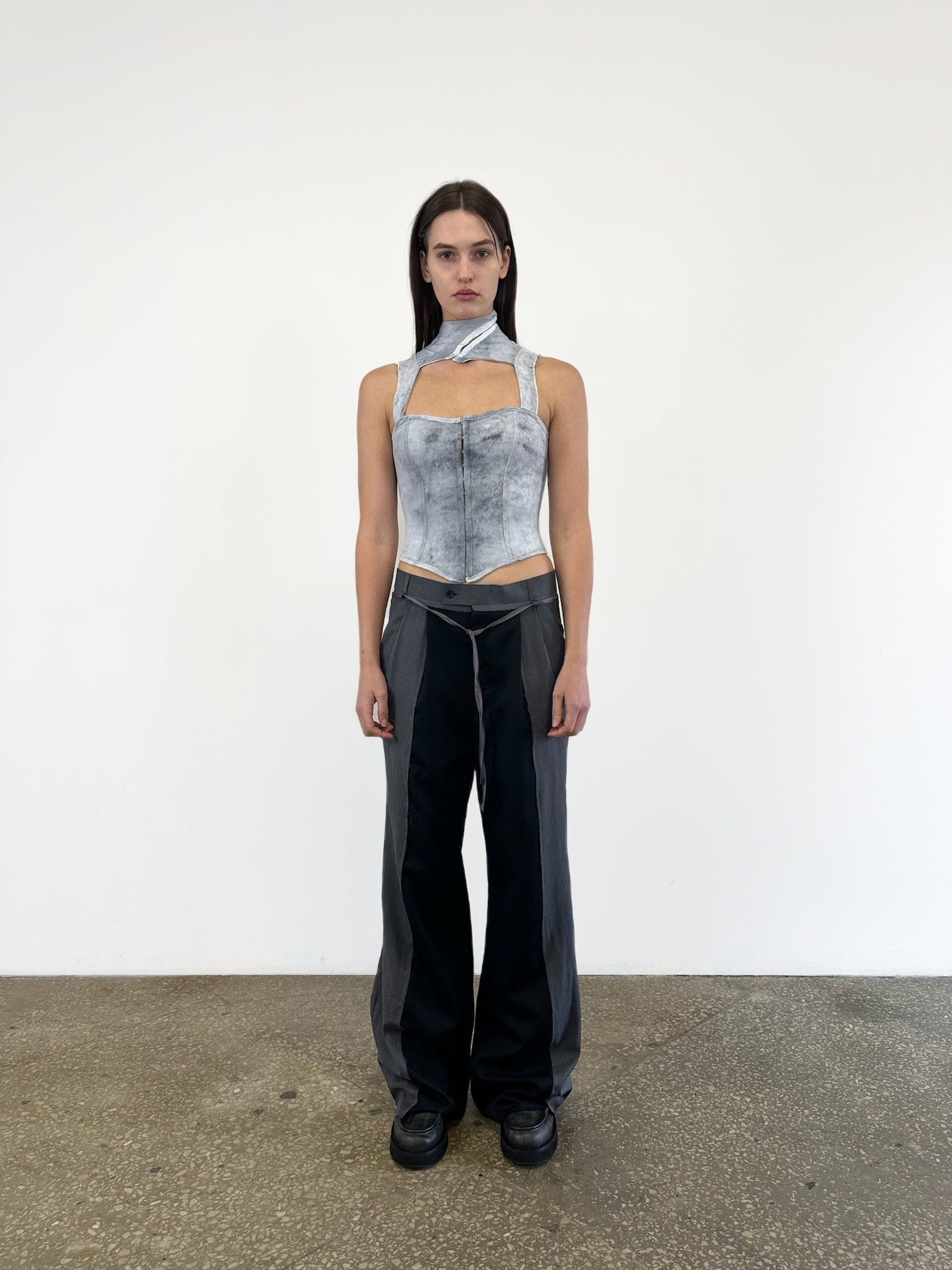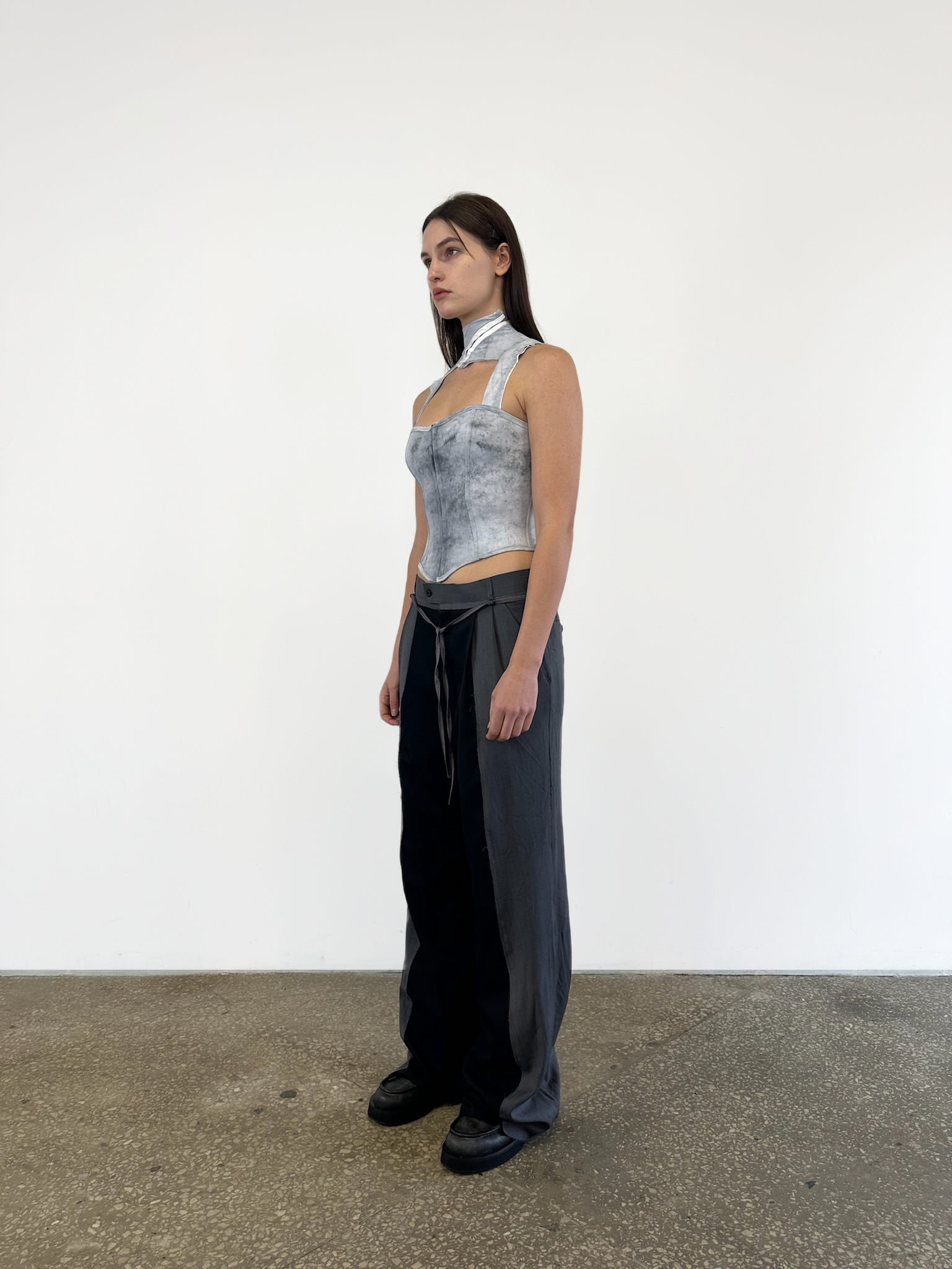 Корсет створений із біфлексу, пофарбованого вручну за допомогою чорної солі — матеріал пройшов спеціальну технологію фарбування, у результаті якої тканина отримала природну, складну фактуру з ефектом м’якого затемнення
