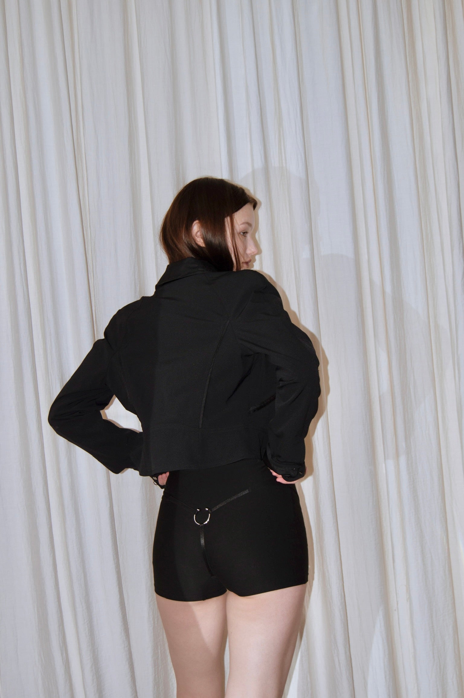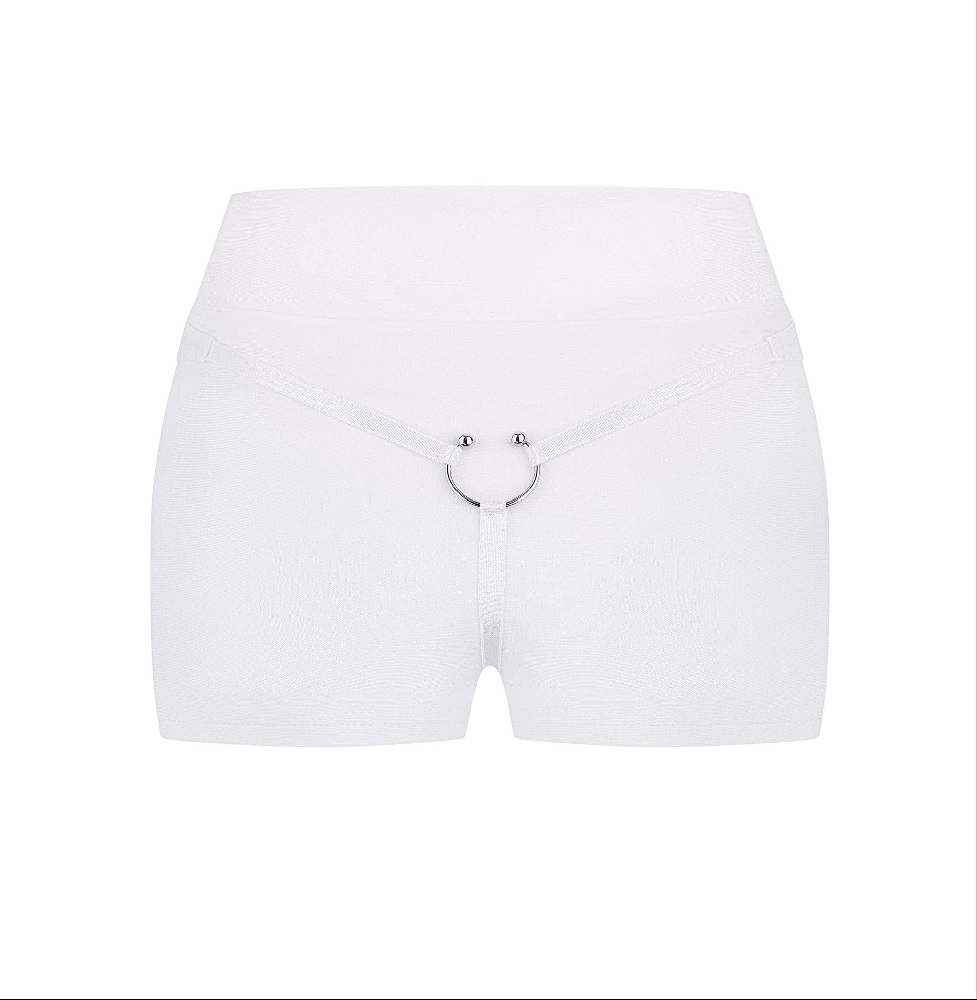 Шорти виконані з м’якого еластичного трикотажу, поверх яких інтегровано елемент білизняного крою — трусики, що створюють багатошаровий ефект
