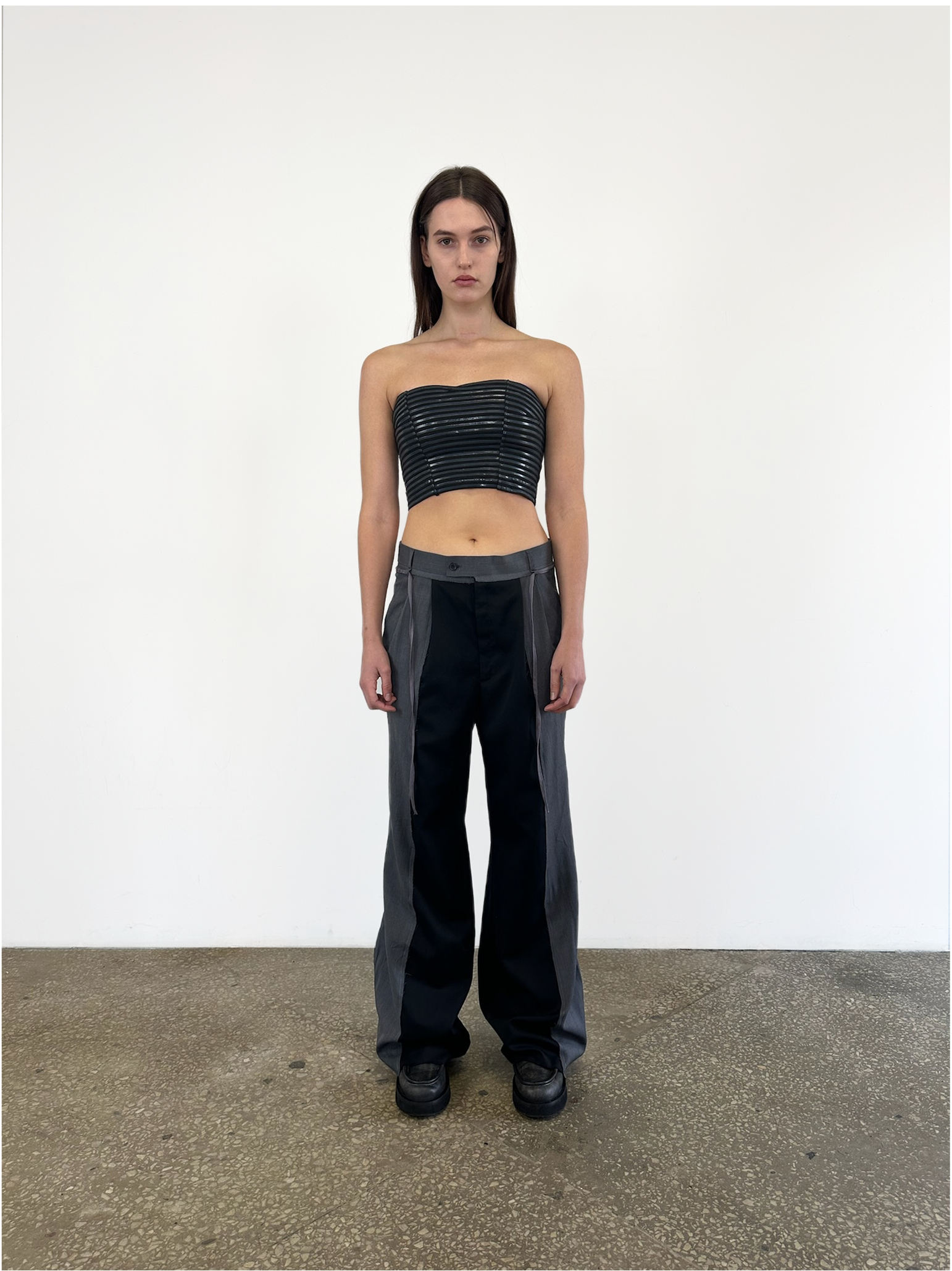 Форма зберігає стриману класичну структуру, але переосмислена через видимі необроблені шви та широкий об’єм, що додає виразності силуету